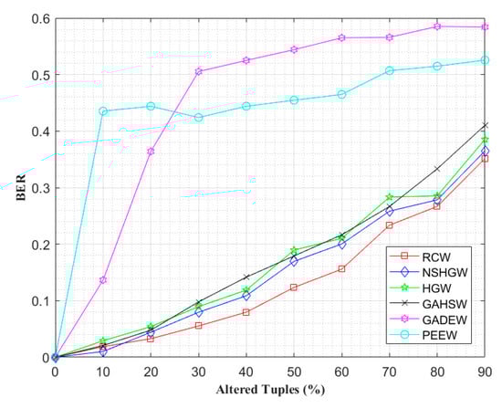 Alteration attack is a random modification of a database property. After the attacker makes the modification tuple attack on the database, we can restore the damaged database as long as most of the data embedded in the watermark information are not modified. Figure 5 shows the BER of the watermark extracted by RCW, NSHGW, HGW, GAHSW, PEEW, and GADEW methods after modifying the attack. The experimental results show that the BER of the extracted watermark increases with the increase of data modification. The number of modified tuple in the database was changed to 90%. NSHGW, HGW, GAHSW, GADEW, and PEEW extracted watermarks with BER values of 0.365, 0.385, 0.410, 0.584, and 0.526, respectively. However, the BER extracted by the RCW watermark is 0.352. In a database, it is difficult to extract the watermark tuples affected by the attack from the remaining unaffected data if the majority of the watermark tuples are modified. If it is only about half of these tuples, it can be recovered.