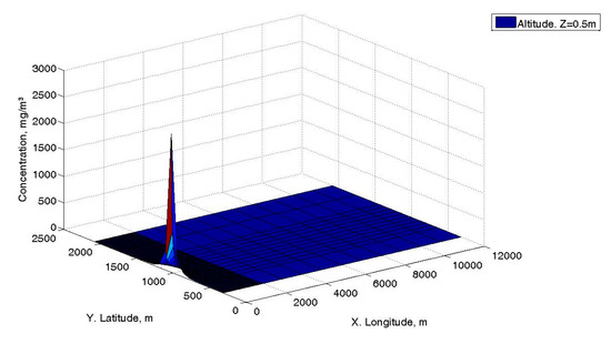 Case 2 would be expected to present a higher concentration near the source as it has a lower wind velocity. However, the possible combination of the fumigation effect of stable conditions and the convective phenomena of its stability make its concentration lower than in Case 1. Finally, if cases 1 and 4 are compared, at positions close to the emission source, approximately half the concentration is obtained in Case 4 (Figure 13) when compared with Case 1 (Figure 8). In more distant positions, the concentration decreased more rapidly in the instantaneous case, possibly by the amount of mass emitted and the release time. Clearly, with increasing time, the concentration of Case 4 decreased as this was an instantaneous emission.