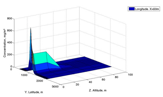 Ma et al. [47] indicated in their article that they used a point source of continuous emission. Therefore, in the simulation, we adjusted the time following the criteria given by Hanna [39,47,48]. The simulation presents a scenario composed of a volume of 12,000 × 2500 × 100 m using a fine mesh of 2000 × 800 × 5 m close to the emission source. Figure 6, Figure 7, Figure 8, Figure 9 and Figure 10 show the results of the simulation. Figure 6 and Figure 7 are 3D representations with concentrations and two spatial coordinates. Thus, Figure 6 shows the concentration distribution at 0.50 m of height for a section of 12,000 for the x-coordinate and 2500 m for the y-coordinate. As can be seen, the concentration falls rapidly to very low values in the first 1000 m. Figure 7 shows the distribution in the y and z coordinates, setting x to a value of 50 m. This figure shows that the concentration starting from 40 m decays rapidly. For both figures, the concentration distribution on the y axis is symmetric with respect to the emission source. The rest of the figures are representations of the concentrations against a spatial coordinate.