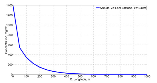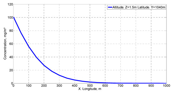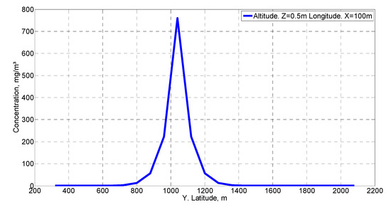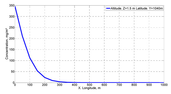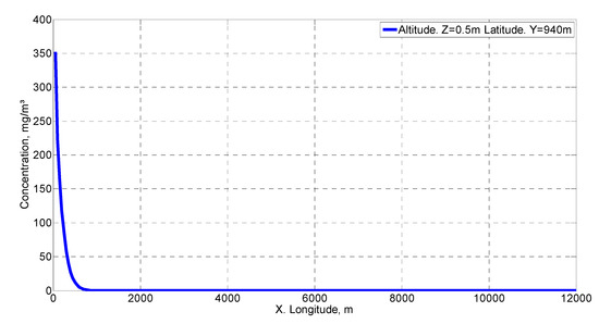 Figure 8 shows the concentration distribution on the x-axis in the wind direction with the same coordinates as the source for x and y. This figure has been used for the validation of the methodology used according to the criteria given by Hanna [39]. Figure 9 illustrates the concentration distribution on the x-axis in the direction of the wind at the same height and at 100 m from the emission source at the y-coordinate. Finally, Figure 10 shows a cross section to the wind direction at 100 m in the x-coordinate and at the same height as the emission source. These last two figures are the ones that best allow us to observe the behavior of the concentration distribution, particularly the one represented in the wind direction.