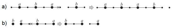 A chain of an odd (even) size is called odd (even); 0 is an even number, and −1 is odd. The definition of a type of a chain plays a crucial role. First, assume that a chain does not contain conventional edges. Then, 1a is an odd chain with one hanging b-edge; 2a* is an odd chain with two hanging b-edges; 2a is a b-singular isolated vertex; 2a denotes type 2a* or 2a. Type 3a* is an odd chain without hanging edges, with two extremal a-edges, and having a b-singular vertex; 3a’ is a chain aa; 3a denotes type 3a* or 3a. Type 1a* is an even chain with one hanging a-edge that has a b-singular vertex; 1a is a hanging a-edge; 1a denotes type 1a* or 1a. Similar definitions are given with b instead of a. Type 2* is an even chain with two hanging edges nonincident to each other; 2 is two hanging edges incident to a common conventional vertex; 2 denotes type 2* or 2. Type 3 is an even chain without hanging edges but having singular vertices; 0 is a chain without singular vertices. The chain types were presented in Figure 6 in [2]. The type of a chain with conventional edges is defined as the type of a chain obtained by cutting them out; it does not depend on the order of cuttings (see Lemma 6 in [7]).