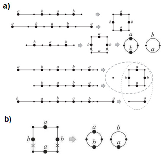Figure 3. (a) Circularizing a chain. Chain types, from top to bottom: 1b, 2b, 3b, 1a, 3, 2. (b) Cutting out a cycle of size 2 from a cycle of size 4.