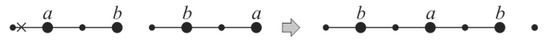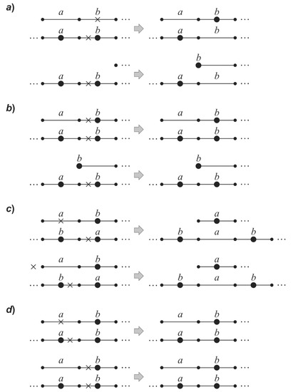 An operation o’ over a + b is defined through an operation o over a by commutativity: o’(a + b) = o(a) + b. Thus, over a breakpoint graph, the five operations listed below are allowed, which are shown in Figure 5 in [2]. In fact, the number of operations is six, since the fifth one, removal of a singular vertex, divides into removal of an a-singular vertex, which corresponds to deleting a block in a, and removal of a b-singular vertex, which is inverse to inserting a block in b.