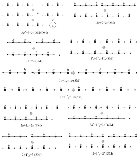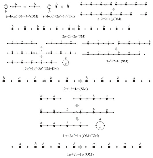 Stage 2: 2-interactions are SM applied to two different chains with the following term equalities (a cut chain is always given the first; on the right-hand side, we do not present conventional isolated vertices): 1a + 1b = 1*b [wa + wb], 3a* + 2b* = 1a [wb], 3a* + 2b’ = 1a [wa], 3a’ + 2b* = 1a [wa], 3a’ + 2b’ = 1a [wa], 3b + 2a = 1b [wb], 3 + 2 = 1*b [wa + wb 1], (1a + 2b*) + 3=1*b [wa + 2wb − 1], (1a + 2b’) + 3 = 1*b [2wa + wb − 1], (1b + 2a) + 3=1*b [wa + 2wb − 1], (3a* + 1b) + 2 = 1*b [wa + 2wb − 1], (3a’ + 1b) + 2=1*b [2wa + wb − 1], (3b + 1a) + 2=1*b [wa + 2wb − 1], 1a + 2=2a* [wa + wb − 1], 1b + 2 = 2b* [wa + wb − 1], 3 + 1a = 3a* [wa + wb − 1], 3 + 1b = 3b* [wa + wb − 1], (3b + 1a) + (1a + 2b*) = 1*b [wa + 3wb − 1], (3b + 1a) + (1a + 2b’) = 1*b [2wa + 2wb − 1], (3a* + 1b) + (1b + 2a) = 1*b [wa + 3wb − 1], (3a’ + 1b) + (1b + 2a) = 1*b [2wa + 2wb − 1], 1a + (1a + 2b*) = 2a* [wa + 2wb − 1], 1a + (1a + 2b’) = 2a* [2wa + wb − 1], 1b + (1b + 2a) = 2b* [wa + 2wb − 1], (3b + 1a) + 1a = 3a* [wa + 2wb − 1], (3a* + 1b) + 1b = 3b* [wa + 2wb − 1], (3a’ + 1b) + 1b = 3b* [2wa + wb − 1], 1a + 2b* = 2 [wb], 1a + 2b’ = 2 [wa], 1b + 2a = 2 [wb], 3a* + 1b = 3 [wb], 3a’ + 1b = 3 [wa], 3b + 1a = 3 [wb], 3 + ((3 + 2b*) + 2a) = 1*b [wa + 3wb − 2], 3 + ((3 + 2b’) + 2a) = 1*b [2wa + 2wb − 2], (3a* + (3b + 2)) + 2 = 1*b [wa + 3wb − 2], (3a’ + (3b + 2)) + 2 = 1*b [2wa + 2wb − 2], (3a* + 2) + 2 = 2a* [wa + 2wb − 2], (3a’ + 2) + 2 = 2a* [2wa + wb − 2], (3b + 2) + 2 = 2b* [wa + 2wb − 2], 3 + (3 + 2a) = 3a* [wa + 2wb − 2], 3 + (3 + 2b*) = 3b* [wa + 2wb − 2], 3 + (3 + 2b’) = 3b* [2wa + wb − 2], (3 + 2b*) + 2a = 2* [2wb − 1], (3 + 2b’) + 2a = 2* [wa + wb − 1], 3a* + (3b + 2) = 3 [2wb − 1], 3a’ + (3b + 2) = 3 [wa + wb − 1], and OM with the equalities 1a + 1a = 3a* [wa + wb − 1], 1b + 1b = 3b* [wa + wb − 1].