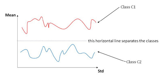 The ideal case is one in which all the points of one class (C1) are above that horizontal line, while all the points of the other class (C2) appear below that same horizontal line.