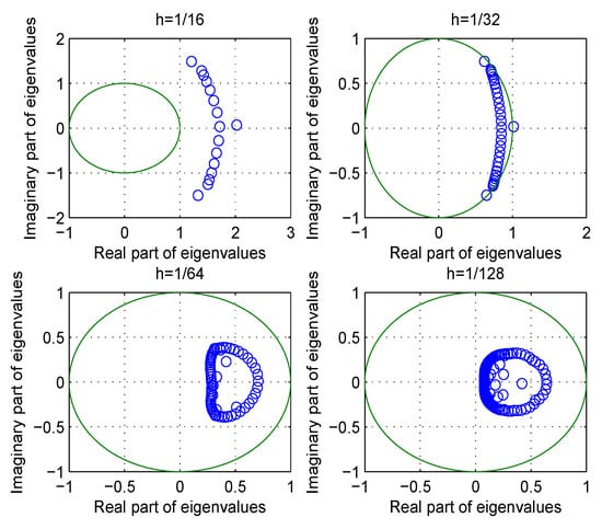 where denotes the maximum of the kernel function and the above inequality is derived from the Lesbegue constant of the polynomial interpolant (see [25]). We obtain whenever which enables us to compute by Gaussian elimination, as is done in [22]. Therefore, the well-posedess of the solution computed by is guaranteed. It is noted that when we encounter stiff problems, the maximum may be large, which implies we have to apply a particularly small stepsize h and restricts the application of the collocation method. However, due to the compactness of Volterra integral operator, the spectrum of will be found in the neighborhood of 0 with a tolerance stepsize, and the multistep collocation method is feasible in practical uses. In Figure 1, we show the discretized spectrum of by considering the kernel function with the maximum It can be seen that eigenvalues are bounded by the unit circle when the stepsize decreases to which guarantees the solvability of the linear system.