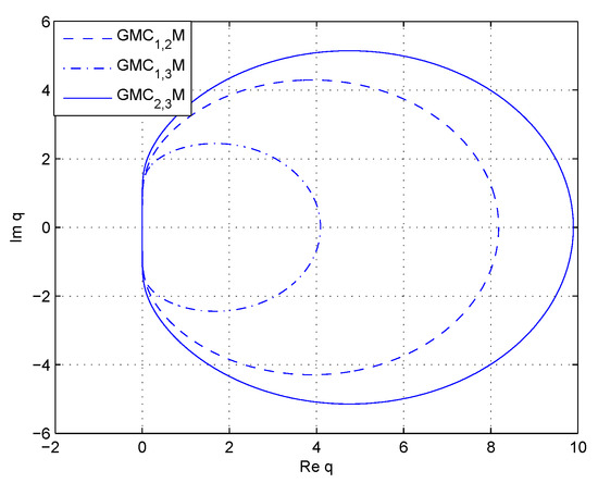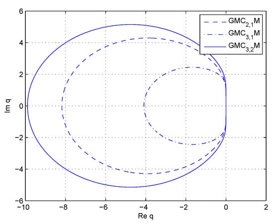 It can be seen that these trajectories are Jordan curves, which implies is the boundary of corresponding absolute stability region. The stability region in Figure 2 is the part outside the boundary curves, while that in Figure 3 is the inside part. Therefore, we can conclude that has wide stability region in the case of In addition, the boundary trajectories of and are symmetric with respect to virtual axis.