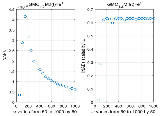 In Figure 4, we plot the scaled infinite norm of absolute error according to the corresponding order by letting , and varies from 50 to The left part shows the infinite norm of the error and the right part shows the absolute error scaled by corresponding rates. It can be seen that the increase of the frequency parameter makes the absolute error get smaller. This indicates as the kernel becomes more highly oscillatory, computed approximation becomes more accurate. Considering the right part of Figure 4, we find that when the frequency parameter reaches the curve turns to a horizontal straight line, which is in agreement with the estimate given in Theorem 9.