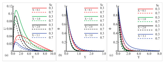 - The Schmidt number exerted a noticeable influence on the heat and fluid flow mechanism around the surface of the sphere and in the plume region in terms of velocity profile, temperature profile, and mass concentration.