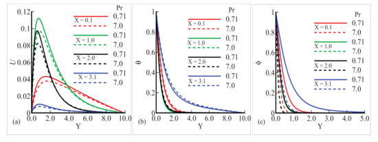 - The effect of thermophoresis parameter Nt cannot be neglected, as due to an increase in the magnitude of this parameter, the velocity profile is maximum at position X = 1.0, while the heat and mass transfer are reduced at the same position.