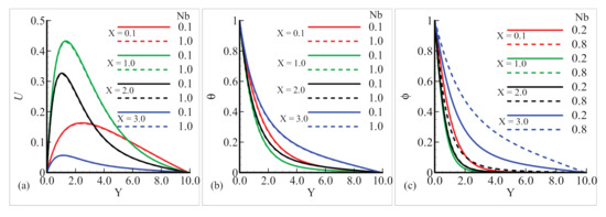 - The variation in the Brownian motion parameter Nb results in distinct changes in the thermal and flow field, depending on different positions around the surface of the sphere and in the plume region. The Brownian motion demonstrated its increasing effect for velocity at position X = 1.0, and dominated at the same position for temperature distribution and mass concentration.