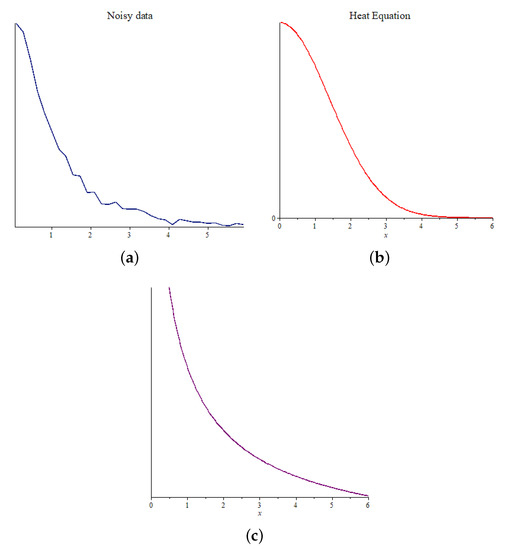 To perceive our solutions compared to existing noise suppression, consider Figure 1. The first graph is simply a noisy data set and (b) is the Gaussian function which is a solution of the heat equation . The heat equation is the benchmark for noise smoothing, eliminating noise but leaving blurry edges at times. In (b), as expected we observe a smoothing of the image and interestingly, (c) also has this feature. We conclude that these solutions are effective in noise smoothing.