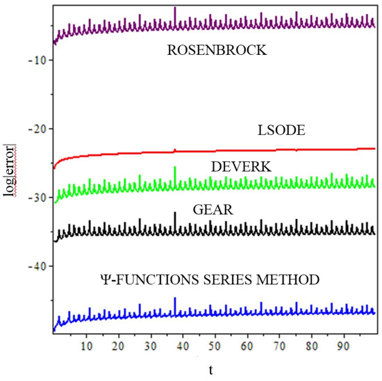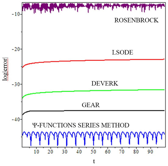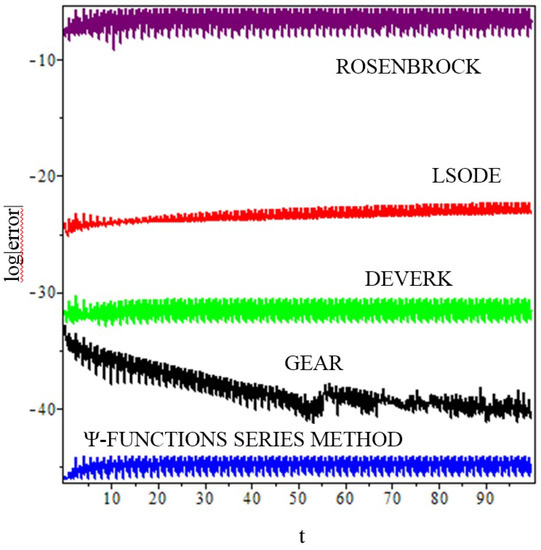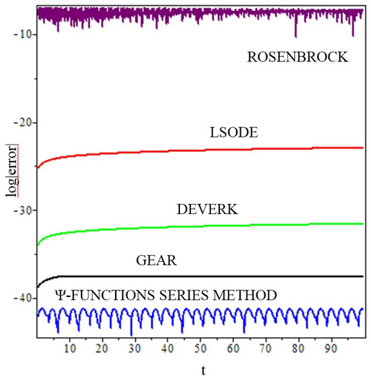 Figure 1 shows the graph of the logarithm of the relative error module of the solution , calculated by means of (45) with three functions, step size , and 50 digits. This result is compared to the numerical integration algorithms: DEVERK78 with a tolerance of , GEAR with errorper = Float(1,−30), LSODE[backfunc] with a tolerance of , and ROSENBROCK with abserr = Float(1,−30).