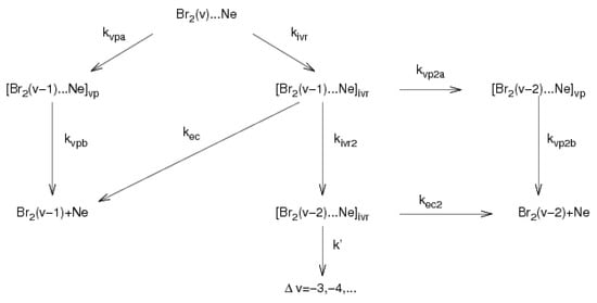 The kinetic mechanism allows us to understand the path followed by our system as it relaxes and dissociates (see Figure 3). We consider Br (intermediate state detected in the TSH simulation) as a sum of two contributions: a short-lived contribution coming from the VP process, which we denote by Br Ne, and a longer-lived contribution coming from the IVR process denoted as Br Ne. Therefore, only the sum is taken into account to fit the kinetic rate constants. We include the Br Ne intermediates in the direct VP process, dividing each direct VP step into two processes characterized by the rate constants and for the loss of the first vibrational quantum, and and for the loss of the second one.