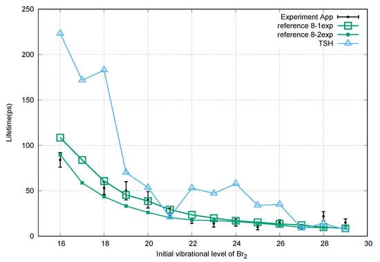 We have investigated the vibrational predissociation process for the NeBr system by using TSH method. In our simulation, we studied a range of vibrational levels (from to ). We found that the larger values for correspond to the lower vibrational levels. This is in correspondence with the dissociated of the molecule occurs just after hopping surface. As we comment in Section 3, there is a competition between VP and IVR processes. The TSH method is a robust methodology for the study of molecular fragmentation for this kind of system. This affirmation could be justified through Figure 6, Figure 7 and Figure 8. In these figures, we showed our results in comparison with the previous theoretical results and the experimental ones. As we can appreciate, the agreements are very good.