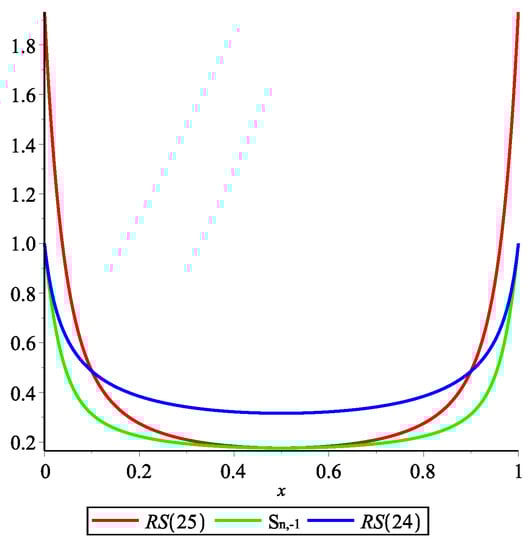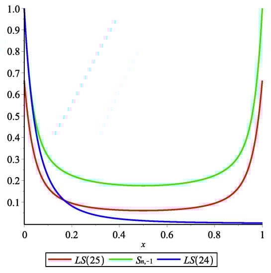 Let . In Figure 2 we give a graphical representation of the lower bound of from (24) and (25), respectively. Denote these bounds with LS(24) and LS(25), respectively. In Figure 3 we give a graphical representation of the upper bound of from (24) and (25), respectively. Denote these bounds with RS(24) and RS(25), respectively. Remark that on certain intervals the results obtained in Theorem 3 improve the result from [11].