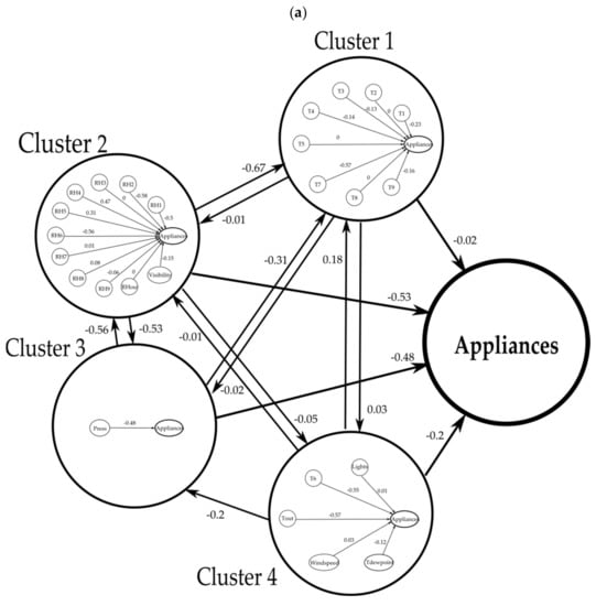 Figure 3 depicts the sample nested structure obtained with the use of the RCGA and SOGA algorithms. The proposed approach based on a genetic algorithm optimization allowed us to construct the nested fuzzy cognitive map in which each node is an independent FCM model containing similar concepts. The appliances’ energy usage prediction can be analyzed at the first (the most general) level or at a more detailed level (with the use of the detailed FCM models constructed for each cluster). Additionally, the use of SOGA allowed the optimization of the nested structure through the selection of the most significant concepts in each cluster.