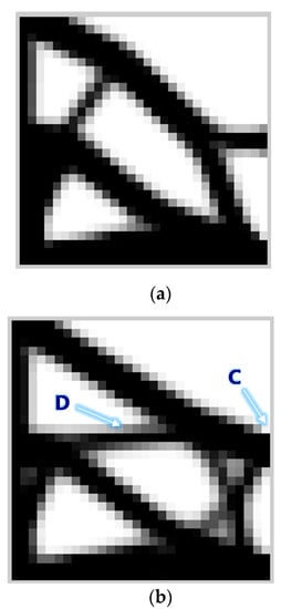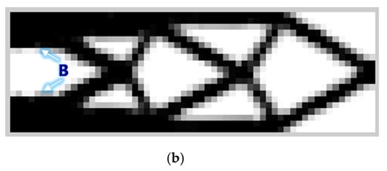 Figure 3 presents the definition of three design problems. Figure 3a is the well-known Messerschmitt–Bölkow–Blohm (MBB) beam problem, which is problem A in this work, and Figure 3b shows a tip loaded cantilever beam problem—problem B. Figure 3c presents a structure with a spring supporter—problem C. The load increases with the loading time step and reaches the boundary condition shown in Figure 3 at the last time step 1.0. The time increment is set Δt = 0.1 in all the examples. Figure 4, Figure 5 and Figure 6 show the results of the design problems. In Figure 4, Figure 5 and Figure 6, each subfigure (a) is the result based on the assumption of elastic deformation, and (b) represents the result of the presented method, the selectively applied plastic work in elastoplastic deformation. In problem A, the designed structure based on elastic deformation, design A–A in this work, has the well-known shape [18] as shown in Figure 4a. The design with elastoplastic deformation (design A–B) shows a slightly different design with a thicker top part, marked A in Figure 4b, since the part A has more chances to go through plastic deformation. In problem B, the result under elastic deformation (design B–A), shown in Figure 5a, represents the well-known shape [40]. The design with the presented method (design B–B) brings a strengthened design to the area, marked B, as shown in Figure 5b. In problem C, each design has a quite different shape. The design under elastoplastic deformation—design C–B in Figure 6b—strengthens the stick part which adjoins the spring (denoted C in Figure 6b) when it is compared with the design under elastic deformation, design C–A in Figure 6a. In addition, design C–B includes a horizontal bar to make D part stronger, as shown in Figure 6b.