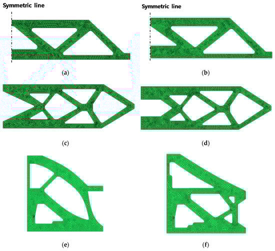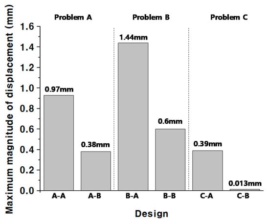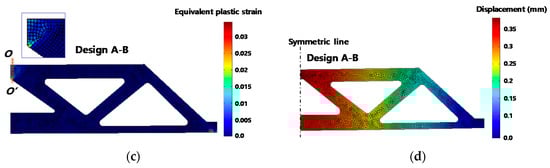 In order to analyze the mechanical performance of the designed shapes, an FEM model of each design was generated with the four-node linear elements, as shown in Figure 7. The boundary condition was the same for each problem shown in Figure 3. The FEM simulation was conducted with the MATLAB code as mentioned above. Figure 8, Figure 9 and Figure 10 show the plastic strain distribution and the displacement field in each model. Figure 8a, Figure 9a and Figure 10a show that the designed structures, under the elastic deformation assumption, lead to large plastic strain zones in the three problems. Since the plastic deformation zones are generated on narrow load paths, the plastic deformation zone could easily result in a plastic hinge, which is a cause of structure collapse. On the other hand, the designed structures in the elastoplastic deformation can drastically reduce the plastic strain, as shown in Figure 8c, Figure 9c and Figure 10c. In terms of the magnitude of displacement, designs A–A and A–B lead to a similar contour of displacement field in Figure 8b,d; however, the maximum magnitude of displacement of design A–B decreases to less than half compared to that of design A–A, as shown in Figure 11. In the same manner, the displacement magnitude of design B–B is about half of that of design B–A as shown in Figure 11, although the displacement contours are very similar in Figure 9b,d. In problem C, a different tendency appears in the displacement analysis. Design C–B not only has a lower value of displacement (about 97% reduction as shown in Figure 11), but also the contours of the displacement field are different when compared to design C–A, as shown in Figure 10b,d. In design C–A, the maximum displacement is generated on the stick part connected with the spring. However, design C–B has maximum displacement on the top and left part. This is because the stick part of design C–A is strengthened by design C–B.