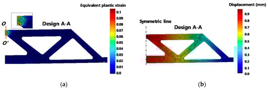 Simulation results of problem A: (a) Plastic strain of design A–A; (b) Displacement of design A–A; (c) Plastic strain of design A–B; (d) Displacement of design A–B.