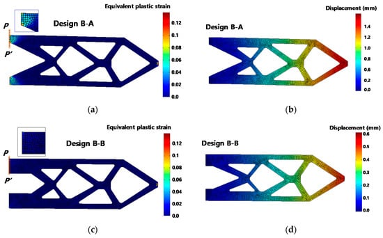 Simulation results of problem B: (a) Plastic strain of design B–A; (b) Displacement of design B–A; (c) Plastic strain of design B–B; (d) Displacement of design B–B.