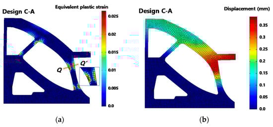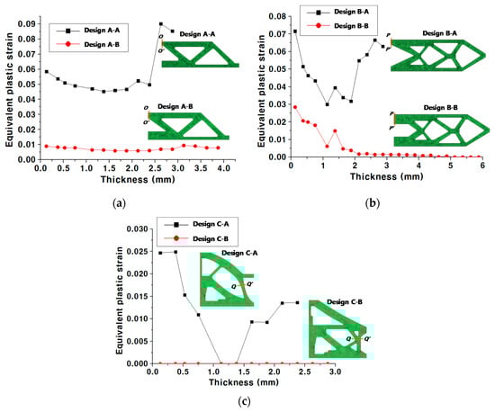 For more discussion, the distribution of plastic strain is analyzed in detail in Figure 13. For the analysis, each section was set on a plastic deformation zone in each problem: section O-O’ for problem A in Figure 8a,c, section P-P’ for problem B in Figure 9a,c, and section Q-Q’ for problem C in Figure 10a,c. As shown in Figure 13, the new designs with elastoplastic deformation result in drastically reduced plastic strain in all of the problems. Through each section line, the level of plastic strain decreases on average more than 80%, and the curve of the plastic strain distribution becomes flatter in the structures designed with the selectively employed plastic work.