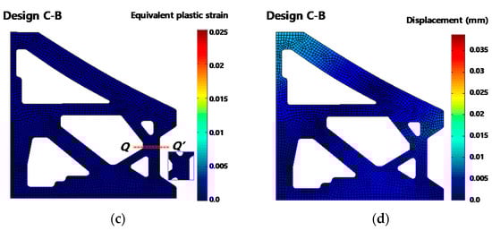 Simulation results of problem C: (a) Plastic strain of design C–A; (b) Displacement of design C–A; (c) Plastic strain of design C–B; (d) Displacement of design C–B.