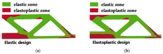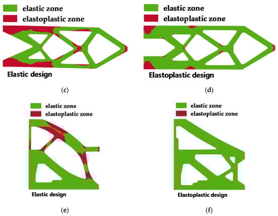 In order to clearly present the elastic and elastoplastic zones, Figure 12 separates the two zones by two colors for the three examples. The green and red colors present elastic and elastoplastic zones, respectively. In all the examples, the designs based on the elastoplastic deformation, shown in Figure 12b,d,f, clearly reduce the elastoplastic zones compared to the designs based on the pure elastic deformation, as shown in Figure 12a,c,e.