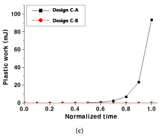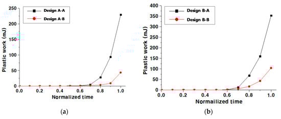Plastic work according to time; (a) Plastic work of designs A–A and A–B; (b) Plastic work of designs B–A and B–B; (c) Plastic work of designs C–A and C–B.