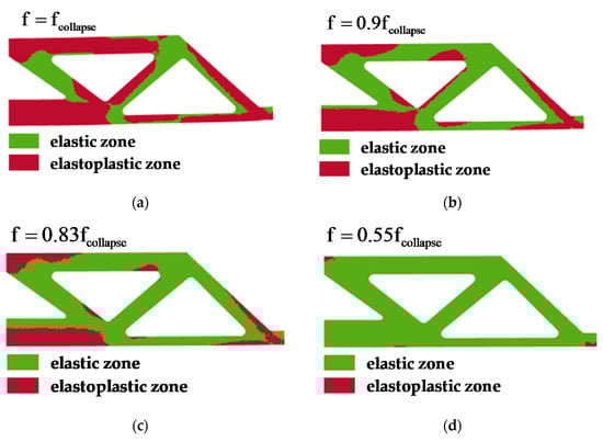 FEM simulation with respect to the difference loading conditions: (a) f = fcollapse; (b) f = 0.9fcollapse; (c) f = 0.83fcollapse; (d) f = 0.55fcollapse.