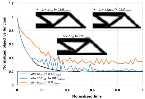 Finally, the stability of the optimization process is discussed. Since the plastic work is separated from the strain energy in elastoplastic deformation zone, the objective function is not perfectly continuous. The plastic work calculation is affected by the time increment and loading boundary condition, so that the stability of the numerical procedure is also affected by them. Figure 16 compares the change in the normalized objective function for different time increments and loading conditions in the MMB example. In this study, the original time increment used in the MMB example (in Figure 3) is set as the reference time increment (Δt = Δtref.). For the load condition, the collapse loading condition in Figure 15 (fcollapse = 360 N) is also set as the reference loading; the load is distributed within 3 mm as in the original example in Figure 3. Three cases are compared in Figure 16. The first case is the same to the original example (Δt = Δtref. and f = 0.83fcollapse) of Figure 3. The second case has the condition of Δt = 1.5Δtref. and f = 0.83fcollapse to check the time increment effect. The third case is designed by the condition of Δt = Δtref. and f = 0.9fcollapse. The objective function is normalized by the initial value of it for each case, and the normalized time 1.0 is the time to reach the target loading condition. The maximum number of iteration at each time step is limited to 100 in this study. As shown in Figure 16, the different conditions do not lead to significant change in design results. Because the volume fraction constraint and the position of elastoplastic zone are the same. For the stability, at the beginning of the optimization for elastic deformation, the three curves are similar. The optimization of the larger time increment (blue curve) case shows a tendency to be minimized, but has unstable fluctuations during elastoplastic deformation. The orange curve for the larger load condition, close to the collapse load, shows more unstable fluctuations during minimizing the objective function. The black curve of the original condition is reliably optimized in the elastoplastic design process. Based on these results, it is recommended to use the appropriate time step and loading condition in optimization processes.