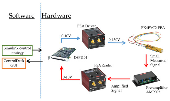 The ancillary equipment consisted of a pre-amplifier Thorlabs AMP002, a measurement cube reader Thorlabs KSG101, a driver cube Thorlabs KPZ101 (which works in open and close loop operation), and controller board dSpace DSP1104. The hardware was configured so that the DSPS1104 could generate an analog signal of 0–10 V and sent to the KPZ101 that magnified into 0–150 V for the PEA actuation. As a result, the strain gauge could monitor the displacement of the PEA and this signal was augmented through the AMP002, which was afterward sent to the KSG101 and scaled in a 0–10V signal, which is the input range that the DSP1104 could acquire.