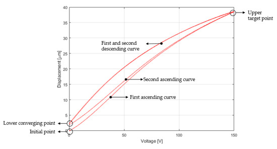 Figure 2 is the PK4FYC2 hysteresis graph for two triangle cycles, where the first ascending curve has its initial point that begins at the origin or also called Initial point and ends at the Upper target point. Provided that the amplitude and frequency of the input do not change [24], this demeanour only occurs for the first rising curve, since the following cycles converge to a single hysteresis curve, where the lower converging point and the upper target point will be permanent. According to this analysis, the conversion from voltage to displacement for reference design cannot be done by multiplying the maximum displacement divided by the maximum voltage which implies a straight line between the initial point and the upper target point. Therefore, a realistic approach is the usage of a straight line as a reference path, where Displacement [m] = m*Voltage [V] + c, where m is 38.5 − c m/150 V and c is the vertical offset of the lower converging point.