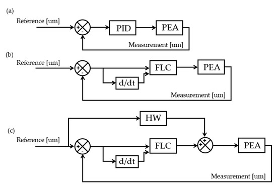 This controller was tested under two frameworks: first, as a feedback structure and, secondly, the HW was added as an FF. The gains had to be different in both cases, since, with the same values, the comparison would have had a significant gap in terms of error. Figure 3b presents a feedback control with FLC that has the role of suppressing errors, alteration of the PEA dynamics, or unknown uncertainties. Figure 3c displays the same structure, but with an FF that pretends to compensate the non-linear effects with an HW model.