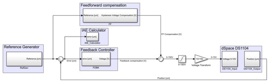 The decline of hysteresis can be done via an advanced control strategy. Feedforward (FF) compensation aims to map the non-linearity of the device in order to compensate for the phenomena; it has been demonstrated that when the PEA is unloaded, FF is effective [22]. However, the error reduction, dynamic changes, and unknown effects are properties in which FF fails to compensate, but where a feedback strategy can deal with. The latter mentioned offers a solution that can increase the precision, although the close-loop can result in a low gain margin that narrows the use of high-gain controllers [13].