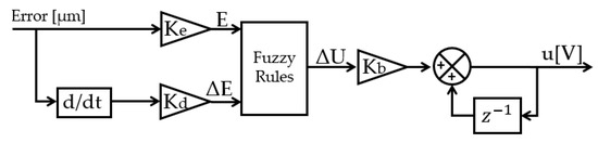 An improved procedure from the last presented architecture is a type-1 fuzzy interference, which is a non-linear controller that operates better than a conventional PID, especially for severe nonlinearities [39]. The input to the controller consists of the error and its derivative that are multiplied by the factors and ; this results in the variables E and E, which represent error and its change normalized in the range of [ 1]. The constant is intended to increase the output of the FLC based on an incremental control action (Figure 5).