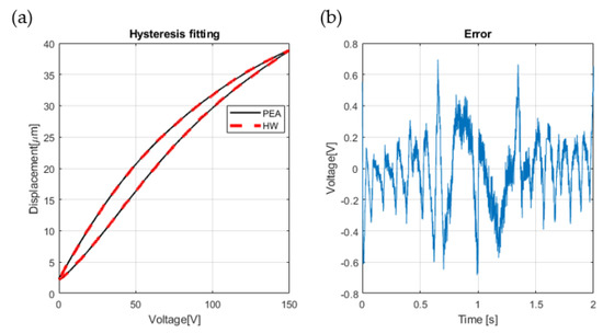 Figure 6a displays the fitting comparison of the HW model with the real data; Figure 6b is an associated error graph that displays the development of the fitting along one arbitrary cycle. The comparison shows an acceptable behaviour, since HW could manage to fit the hysteresis graph from the lower converging point up to the upper converging point, as well as the asymmetry feature that this PEA has. Moreover, the error graph augments the previously described manner, where it can be seen that the magnitude fluctuates between and 1 V; a harsh demeanour occurs at 1 s, which is the moment where the input changes its slope to decrease and, thus, this was an expected unfolding due to the complex alteration.