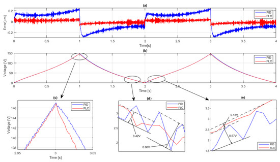 Comparison of error and control signal between PID and FLC. (a): Error; (b): Control signal; (c) Control signal at the top peak; (d): Control signal near the lower peak; and, (e): Control signal after the lower peak.
