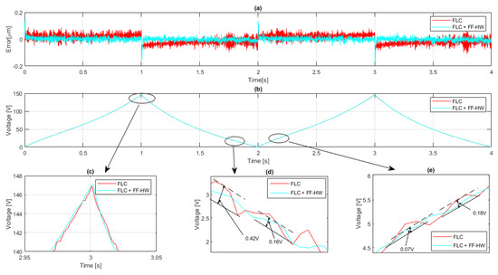 The previous comparison indicated that the FLC performed better than the PID controller and, thus, it was compared with the complex structure with FF since it was expected to increase the performance due to the compensation. Figure 8a shows the error of the two contrasted structures, where the combination of FLC with FF improved the accuracy; although there is a discrepancy during the top peaks, the enhanced framework reduces the error variation, and diminishes the issue at highest levels.