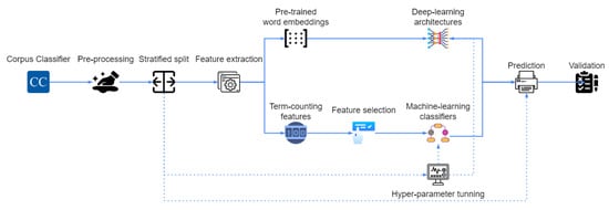 Specifically, in this work we evaluate two different types of supervised machine-learning classifiers. On the one hand, the evaluation of term-counting features with four traditional machine-learning classifiers, including decision trees, support vector machines, logistic regression, and Bayesian classifiers (see Section 3.3.1). On the other hand, three pre-trained word embeddings were used for training four deep-learning architectures, including multilayer perceptrons, convolutional neural networks, and different variants of recurrent neural networks embeddings (see Section 3.3.2).