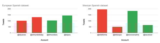 Each dataset contains tweets from four accounts: two satirical and two non-satirical. However, as we can observe from Figure 2, these accounts are not balanced achieving an average of 1205.25 tweets per account with a standard deviation of 216.483 for the European Spanish dataset (see Figure 2 left) and an average of 1239 but with a standard deviation of 763.743 for the Mexican Spanish dataset (see Figure 2 right). The high standard deviation of the Mexican Spanish dataset can cause overfitting, over-weighting stylistic patterns of the predominant accounts (@eldeforma and @eluniversalmx) over the full dataset.