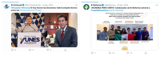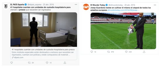 Figure 3 and Figure 4 contain four examples of a satirical and non-satirical tweet for both datasets. In English, the translation are: 41 hospitals have hospital custody units for prisoners (see Figure 3 left), Josep Guardiola insists on watering the grass of all European studios himself (see Figure 3 right), #Survey #veracruz If today were the elections, there would be a technical tie between the #Yunes (see Figure 4 left), and Incredible but true! ElDeforma collaborator trained #LadyMatemáticas (see Figure 4 right).