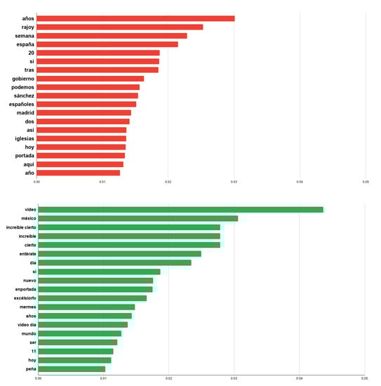 Then, in order to determine what are the most discriminatory features, we obtained the information gain for the twenty unigrams, bigrams, and trigrams for the European Spanish and the Mexican Spanish datasets. These features are shown in Figure 5. As we can observe, in the case of European Spanish (see Figure 5 top), the most informative words are unigrams that represent some of the trending topics at the moment the corpus was compiled, including terms that refer to time (años (years), semana (week), tras (later), hoy (today), others referring to political actors (rajoy or iglesias). A similar finding can be found in the Mexican Spanish dataset (see Figure 5 bottom), in which there are also temporal expressions such as día (day), años (años), or hoy (today).
