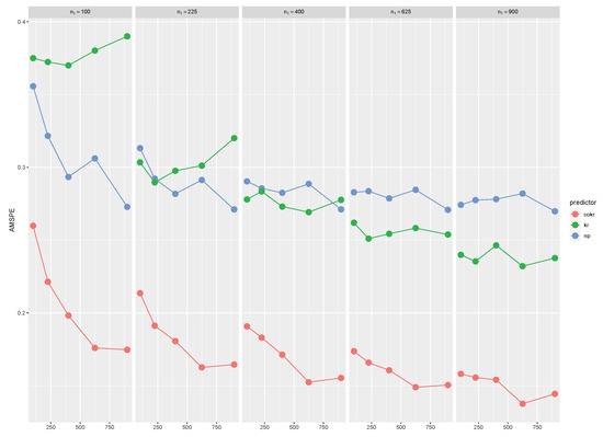 Plots of the AMSPE values obtained for several sample sizes and and correlation , for data drawn from random fields and with constant trends, derived from Gaussian processes and with nugget and spherical semivariograms, respectively. For implementation of the kriging and cokriging approaches, the dependence structures of and were estimated through the theoretical models.