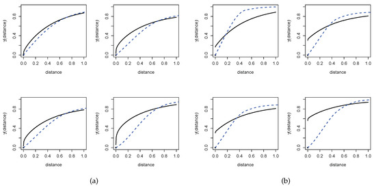 (a) Plots of under a correct characterization of and (Exp-Mat, black solid line) and a misspecified combination (Exp-Gau, blue dashed line). (b) Plots of under a correct characterization of and (Exp-Mat, black solid line) and a misspecified combination (Sph-Gau, blue dashed line).