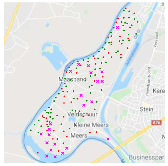 Area in the floodplain of the Meuse river considered for measurement of different pollutants at 155 sampling locations. The 132 points marked on the map display those sites taken for training, by using the values of cadmium and lead respectively collected at the 52 red points and 80 green points. The 23 crosses represent those locations used for validation.