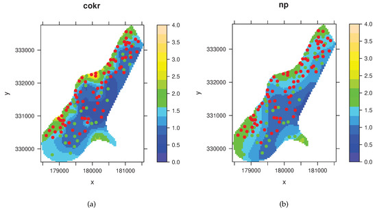 The maps displayed in Figure 4 give evidence of the differences between the two prediction methods considered in the current study, although they also exhibit some common patterns. On the one hand, the area with the smallest levels of Cd, identified with the dark blue color, is located in each case on the central part of the region, towards the eastern border, being of larger size the one achieved with the universal cokriging. Then, as we move away from each of the aforementioned areas, the predicted Cd content increases and the highest values are mainly concentrated on the western border of each domain and its vicinity. Nevertheless, the resulting hot spots range in different magnitudes for the two prediction approaches, so that the universal cokriging provides the largest Cd accumulations, even surpassing the green color scale and reaching values above 3 mg/kg soil, unlike what happens to the non-parametric method.