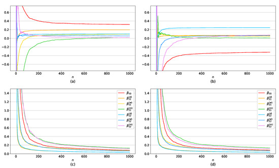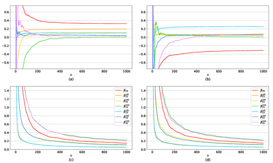 We compute the LSEs for the parameters with replication numbers 500 and give the sample means and standard errors of the 500 estimates in Table 1 and Table 2 with . It is reported in Tables that sample means are closer to the real values of parameters as well as standard errors decreases as n increases. Additionally, Figure 1 and Figure 2 illustrate plots of sample means (a), (b) and standard errors (c), (d) of the LSEs of the parameters as n increases on the horizontal axis: Figure 1a,c and Figure 2a,c for the estimates of and Figure 1b,d and Figure 2b,d for the estimates of .