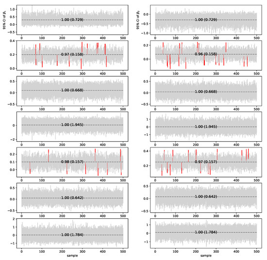 Empirical coverage and average length (in parenthesis) of 95% confidence intervals for seven components of (left column) and (right column) in i.i.d. error case. The horizontal dotted line indicates the true value of the parameter in each plot. Confidence intervals that do not contain the parameter are depicted as red color.