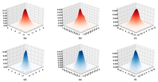 Bivariate normal approximation of some pairs of two chosen estimates ( in i.i.d.case (a–c) and correlated case (d–f).